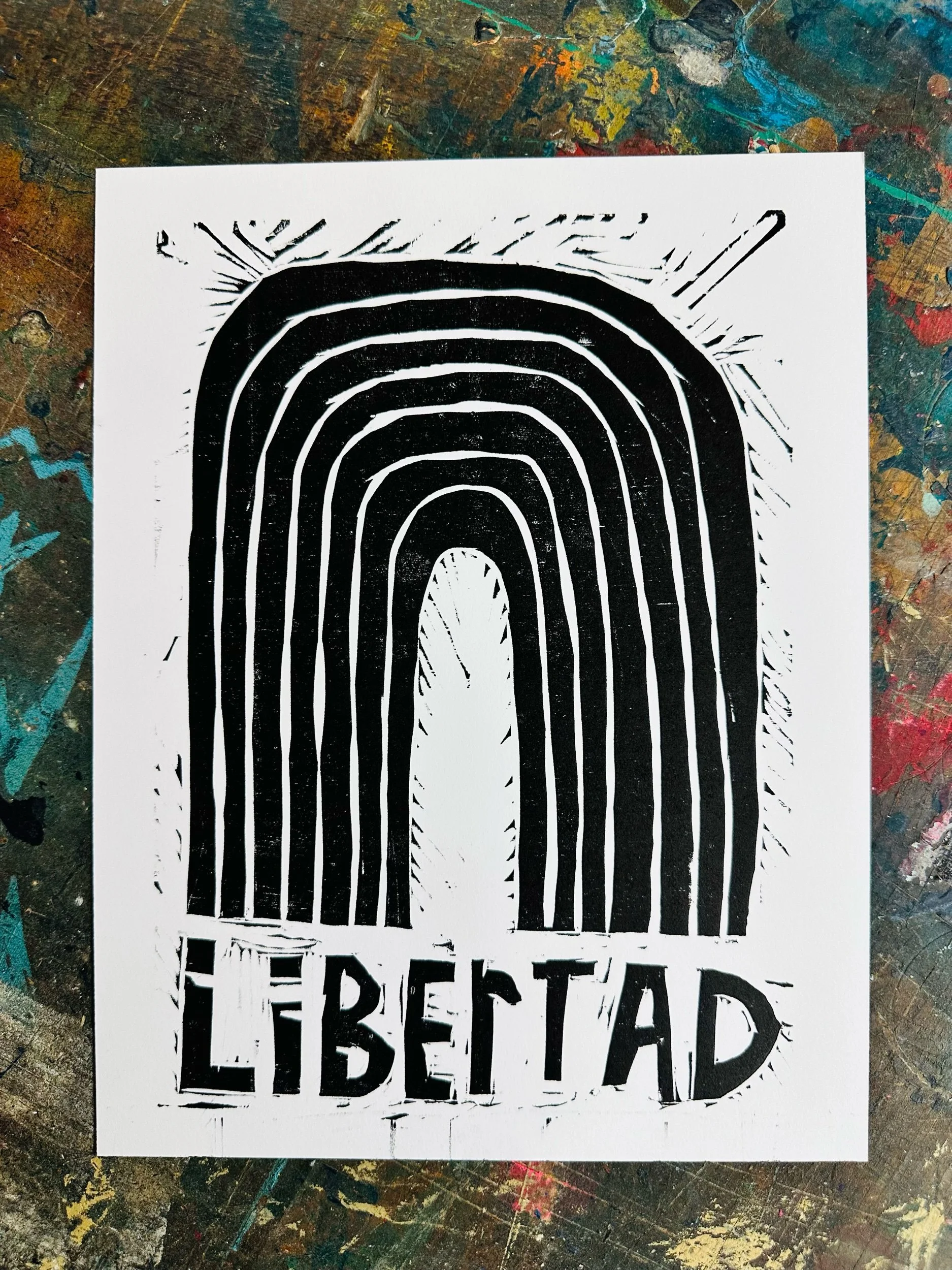 Letterpress printed woodcut on 8 1/2 x 11 paper —-